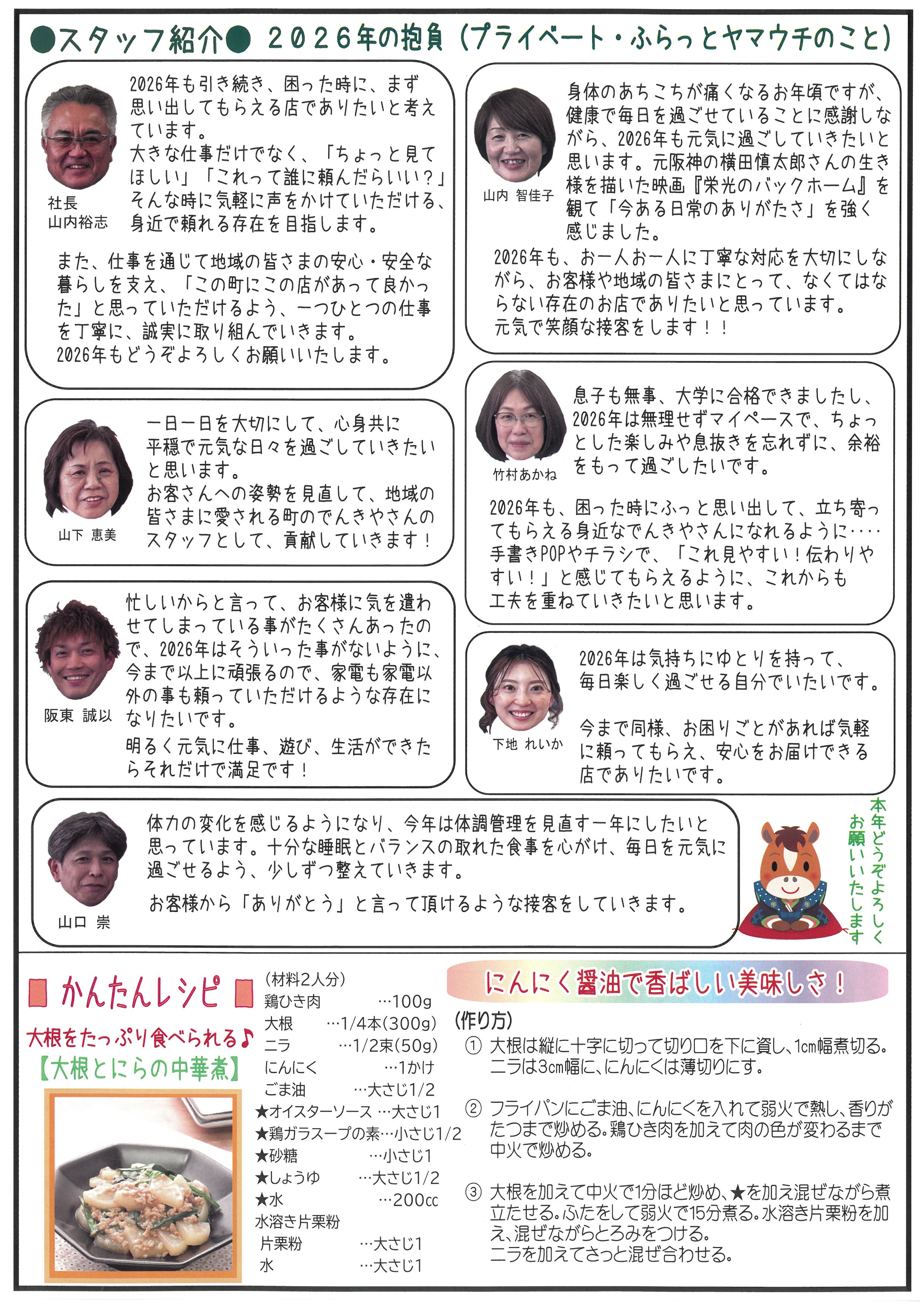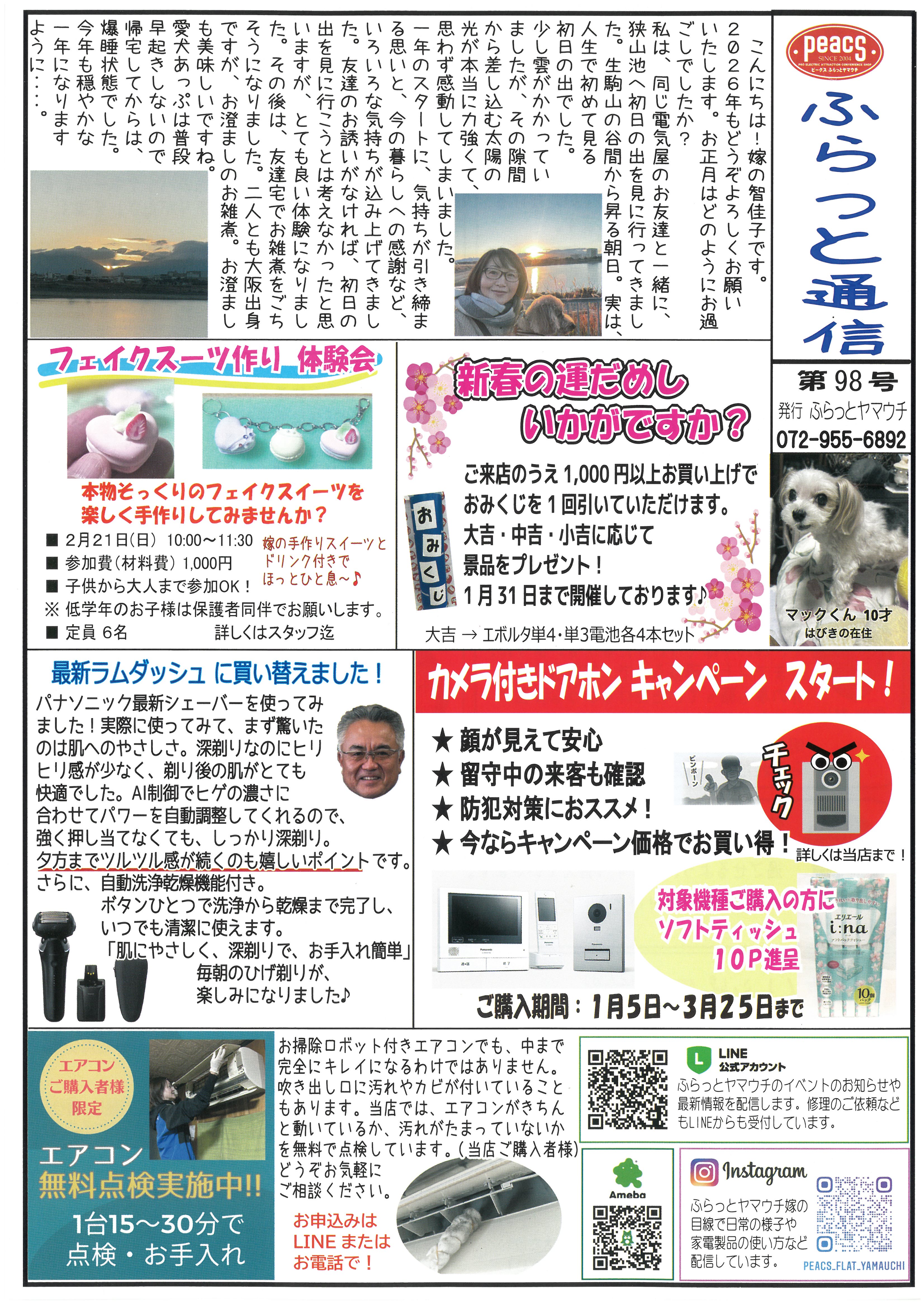 2026.01.10 明けましておめでとうございます!本年もよろしくお願いいたします。 さて、ふらっとヤマウチの『かわら版98号』が出来上がりました! 新年はじめの『かわら版』なのでふらっとヤマウチのスタッフ一同、2026年の今年の抱負をのせております!ぜひご一読ください! 1月のキャンペーンは…防犯には欠かせない!『ドアホン』です!高機能機種も、かなりのお値引きとなっております!モニター付きテレビドアホンで来訪者を確認してからドアを開けてくださいね! もう一つは家事の時短に!『食器洗い乾燥機』。一度使ったら手放せない家電!食洗機を使うことで家事の時短はもちろん、確実に手洗いより節水で、ギトギトな油汚れもキレイに落ちます!つけ置き洗いの要領で節水!手洗い洗剤には含まれない酵素入りの食洗機専用の洗剤と50℃以上のお湯の効果で確実に汚れが落ちます!ぜひ、ご検討ください!! 1月はおうちごはん会、2月はフェイクスイーツ作りにも挑戦!ぜひご予約下さい!! 年末年始休業日のお知らせ 2026.01.10 2025.12.09 年末年始休業日のお知らせ 2025.12.02 \12月ホームベーカリー パン教室開催/ 2025.11.10 ふらっとヤマウチ『かわら版97号』できました! 2025.09.15 10月の補聴器相談会! 2025.09.13 10月『秋の大感謝祭』を開催します♪ 2025.09.13 ふらっとヤマウチ『かわら版96号』できました 2025.06.24 夏のパナソニックフェア開催! 2025.06.07 ふらっとヤマウチの『かわら版 95号』 2025.05.10 6月の補聴器相談会
